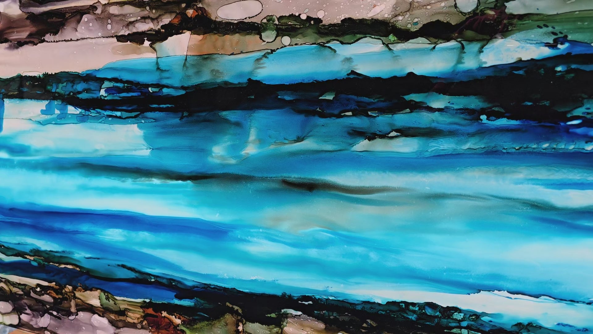 Bring the serene beauty of the ocean into your home with this captivating coastal wall art. Brilliant turquoise and azure blues flow horizontally across the piece like gentle waves rolling toward shore, while organic earth tones frame the composition above and below, evoking weathered driftwood and sandy beaches.