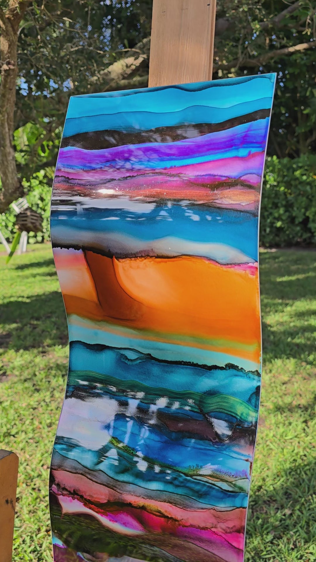 Experience the vibrant energy of Joyful Currents, a stunning contemporary metal wall art piece that brings dynamic color and movement to your space. This artwork features bold horizontal waves of brilliant blues, purples, oranges, and pinks that flow across the surface, creating a mesmerizing visual rhythm.