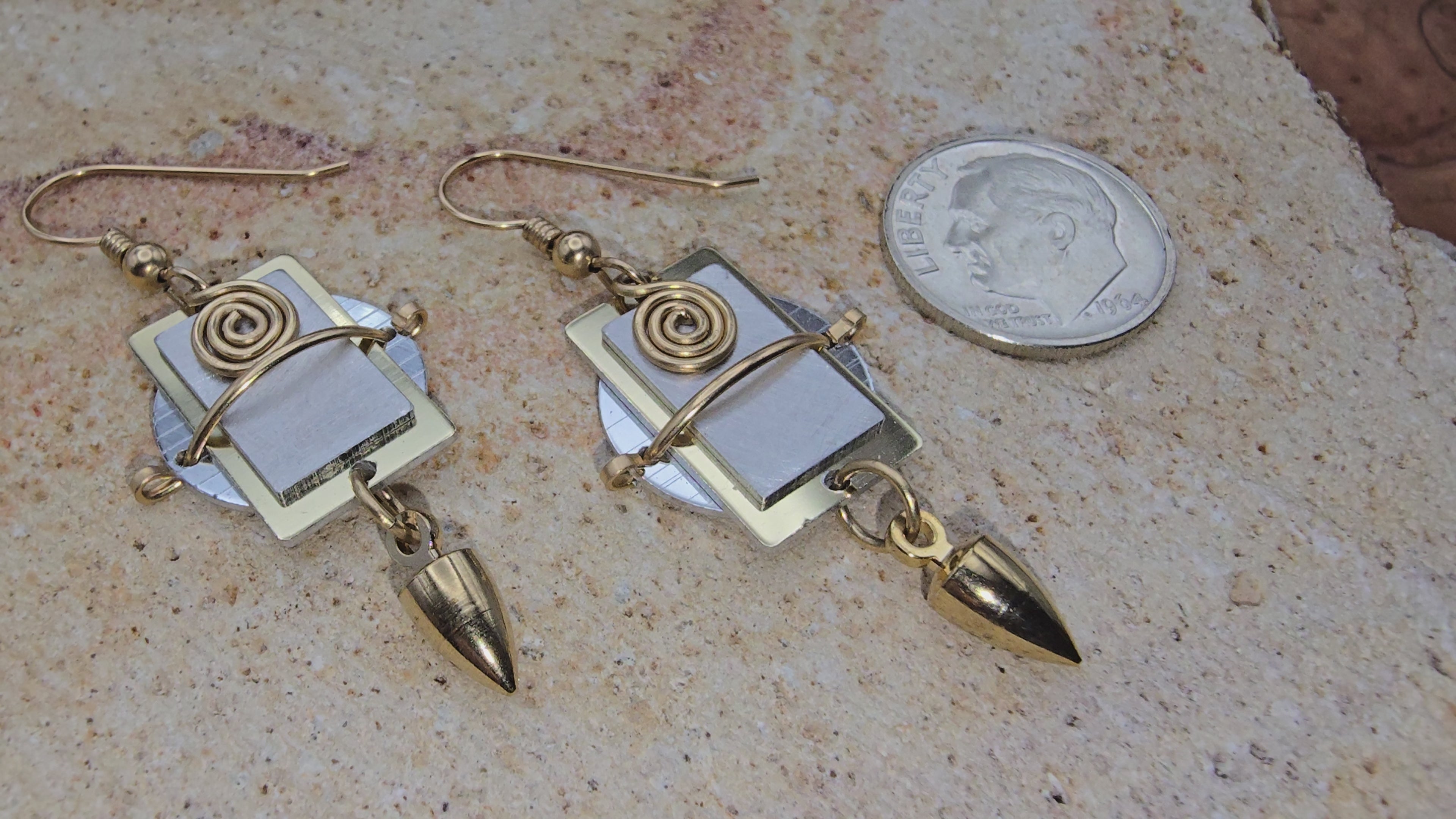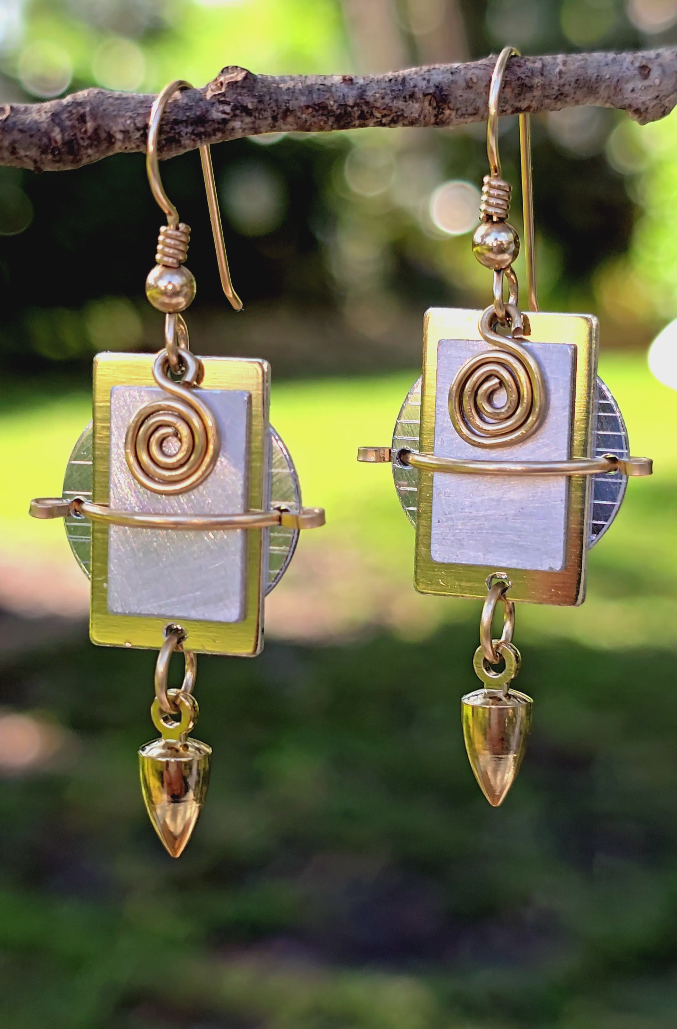 Discover the perfect harmony of materials and design with these stunning mixed media earrings. Each piece features a luminous textured metal centerpiece. 14k gold filled geometric elements, creating a sophisticated balance of organic beauty and modern artistry.